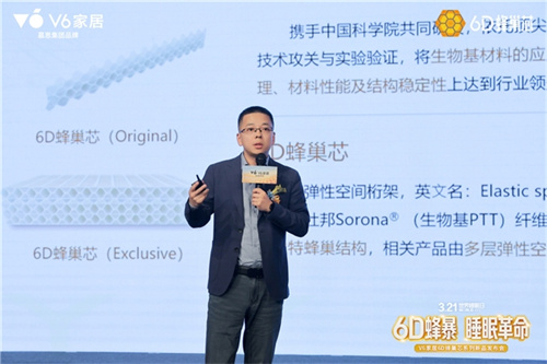 慕思集团CTO陈文泽对6D 蜂巢芯的核心技术,从支撑性、透气性、材料优势到绿色环保几个方面进行了深度的发布。